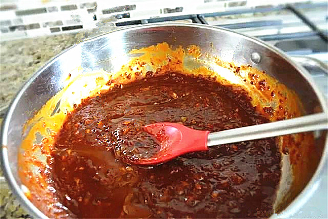 5.待鸡肉变色后放少许洋葱、醋、酱油,再来两大勺豆瓣酱,然后再倒入啤酒,少加些水,把之前炒好的辣椒油倒入,剩下的腌肉汁也一起倒入,大火烧15分钟,改小火炖至肉熟。